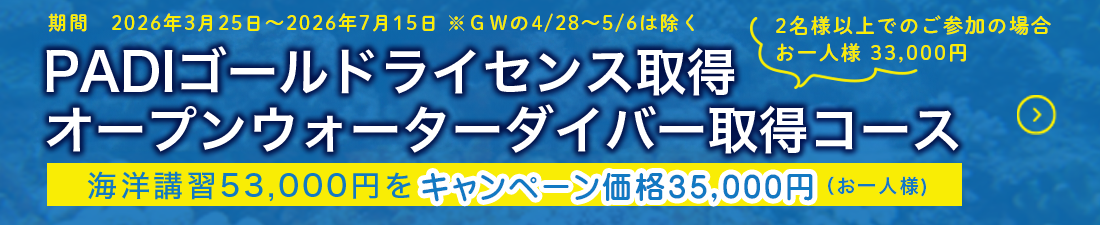 海洋講習がキャンペーン中です! オープンウォーターダイバー講習 『 ダイビングの講習を受けてみたい 』・『 ダイビングを趣味として始めたい 』という方に! 【PADIオープン・ウォーター・ダイバー・...
